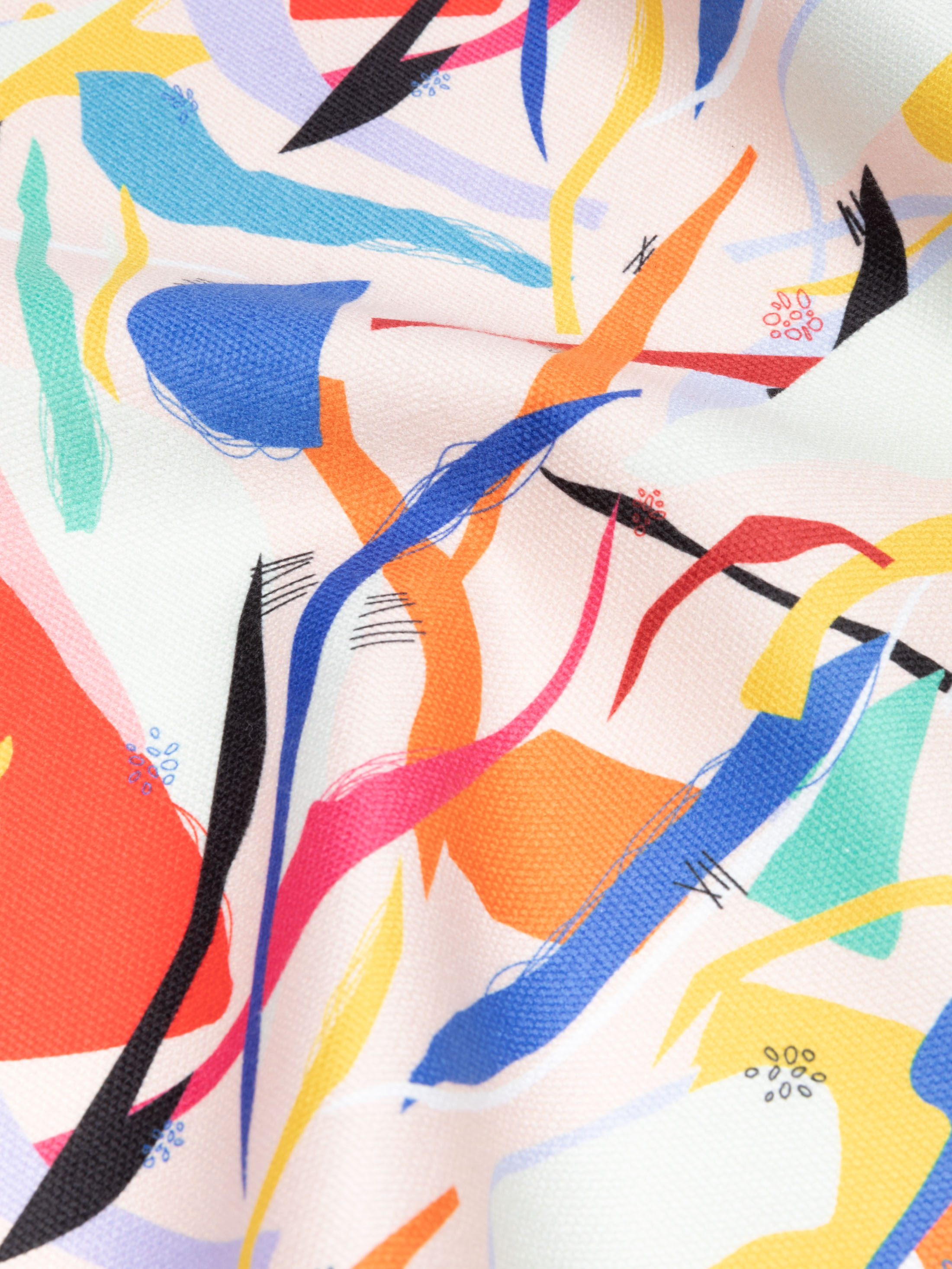 オフホワイトの生地で、プリントの色合いも良く、コントラストも綺麗に映えます。 プリントそれ自体は非常に鮮やかです。また、タイトな編み目にも関わらず、光が当たると裏側からも僅かにプリントが透けて見えます。ディテールも細かく再現され、複雑なパターン柄も問題ありません。