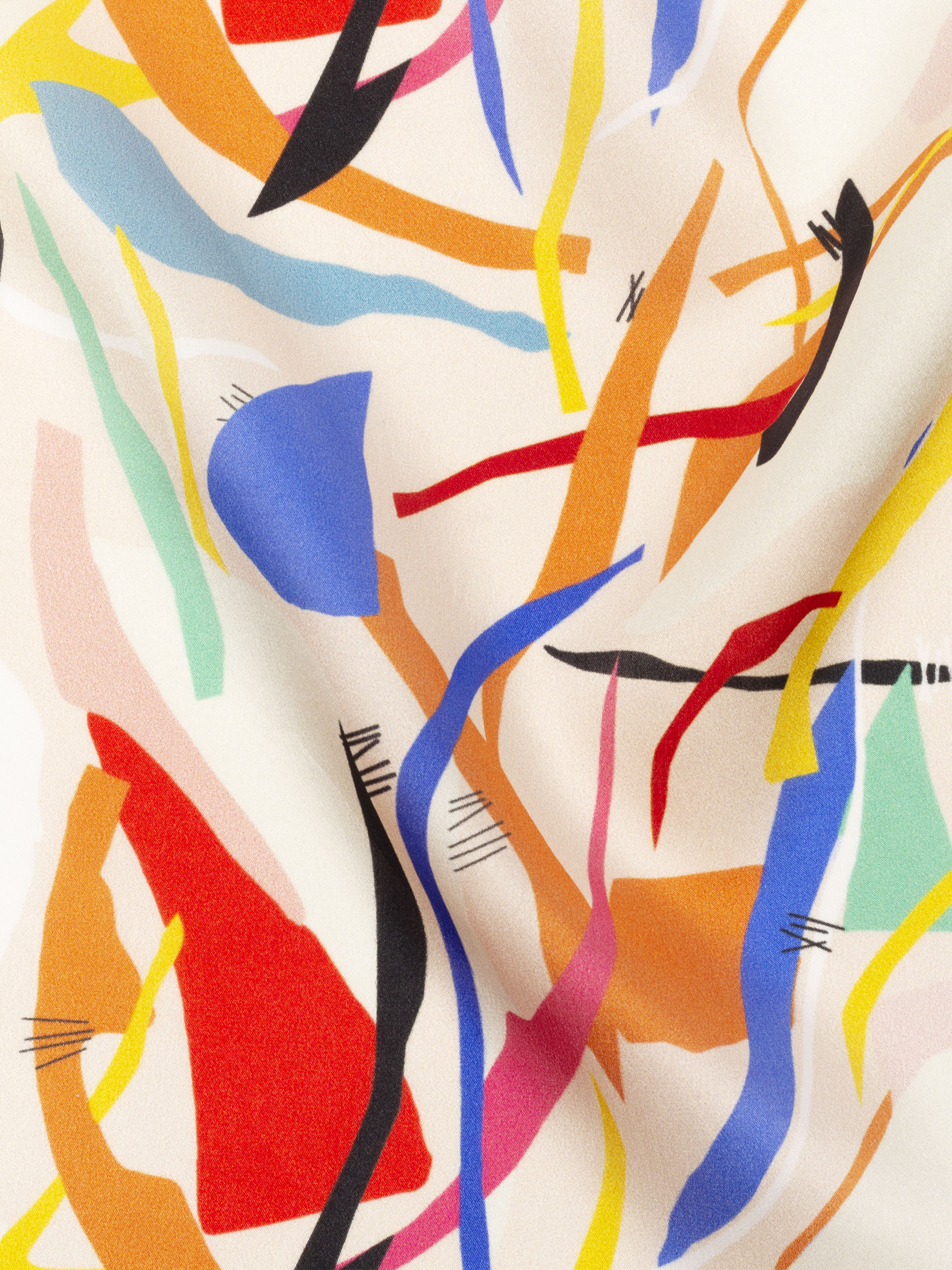 大多数のシルクサテンプロバイダーとは異なり、弊社は最高品質の印刷方法である天然シルク100%生地にリアクティブ印刷を使用しています。生地のベースカラーは、パールのように美しくシルバートーンです。ポリエステル製のものと比べると、プリントは彩度が落ち、薄まる傾向にあり、落ち着いた印象です。表面は光沢があり裏面はややマットな仕上がりで、細かなディテールも細いラインもしっかりと表現でき、カラーブロックもおてのもの。細部にこだわったデザインも綺麗に印刷可能です。天然の絹ならではの素晴らしい光沢があり、これがプリント全体に影響を与えます。他の生地と同様に表面のみのプリントになり、透明度の高いシルク・ジョーゼットに比べると、プリントの透け感はあまりありません。リアクティブプリント技法を使用しているため優れた色深度、洗浄、摩擦堅牢度が実現します。 顔料とは異なり、弊社が使用する反応染料は、染料が直接繊維に化学結合します。つまり、シルクを他の衣類と一緒に洗うことが可能です。