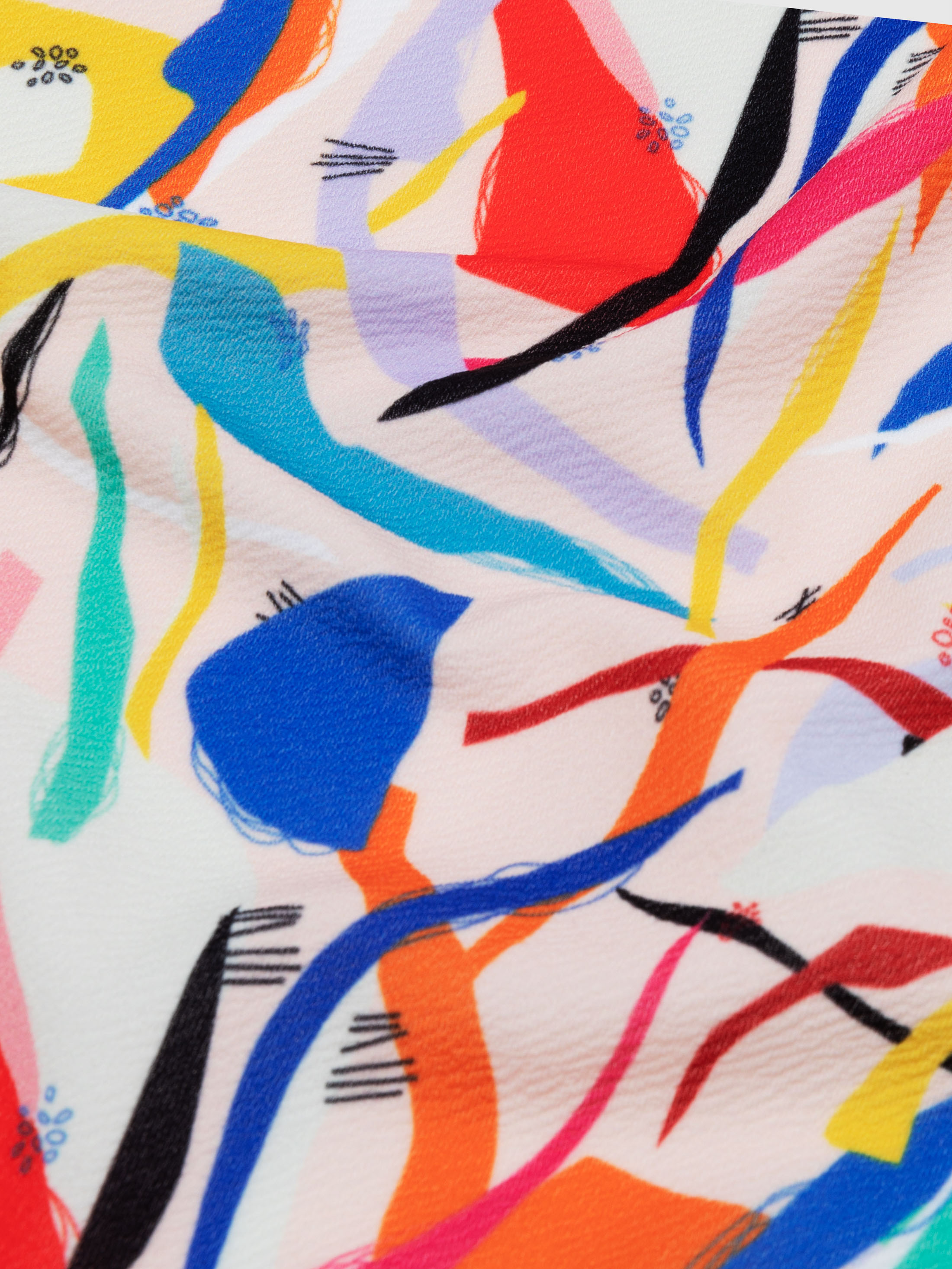ストレッチクレープは真っ白のベーストーンです。あらゆる色やデザインにとって理想的で、シボのある質感にも関わらず、はっきりと鮮やかに印刷できます。ポリウレタン3%を含み、これが生地の柔軟性に一役買います。生地を伸ばすとプリントも同時に伸びてしまいますが、良い縮みもあるので、元の形にすぐに戻ります。