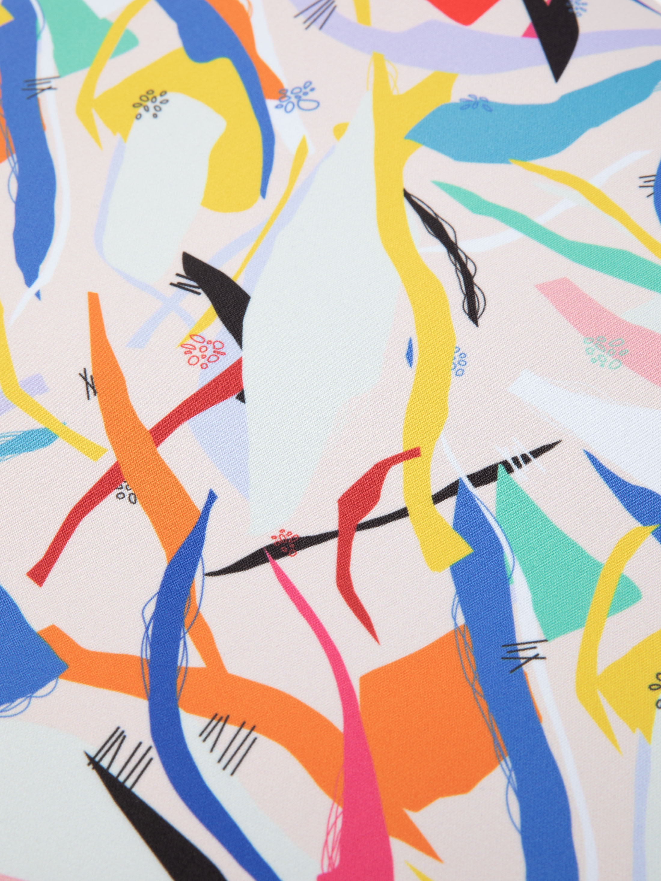 ネオプレン生地への印刷は、コントラードの生地プリントの中でも特にユニークなものです。1000gsmと非常に重く、白いニットが表面に結合した黒のポリクロロプレン素材です。タイトで編み目が閉じています。生地はしっかりとしており、遮光性があるため光を一切通しません。気泡の密度が高い発泡ゴムなので、スポンジのように柔軟性と弾力があり、また吸水性もあります。保冷・保温に優れた素材です。プリント後の厚みは2~4mmほどになります。