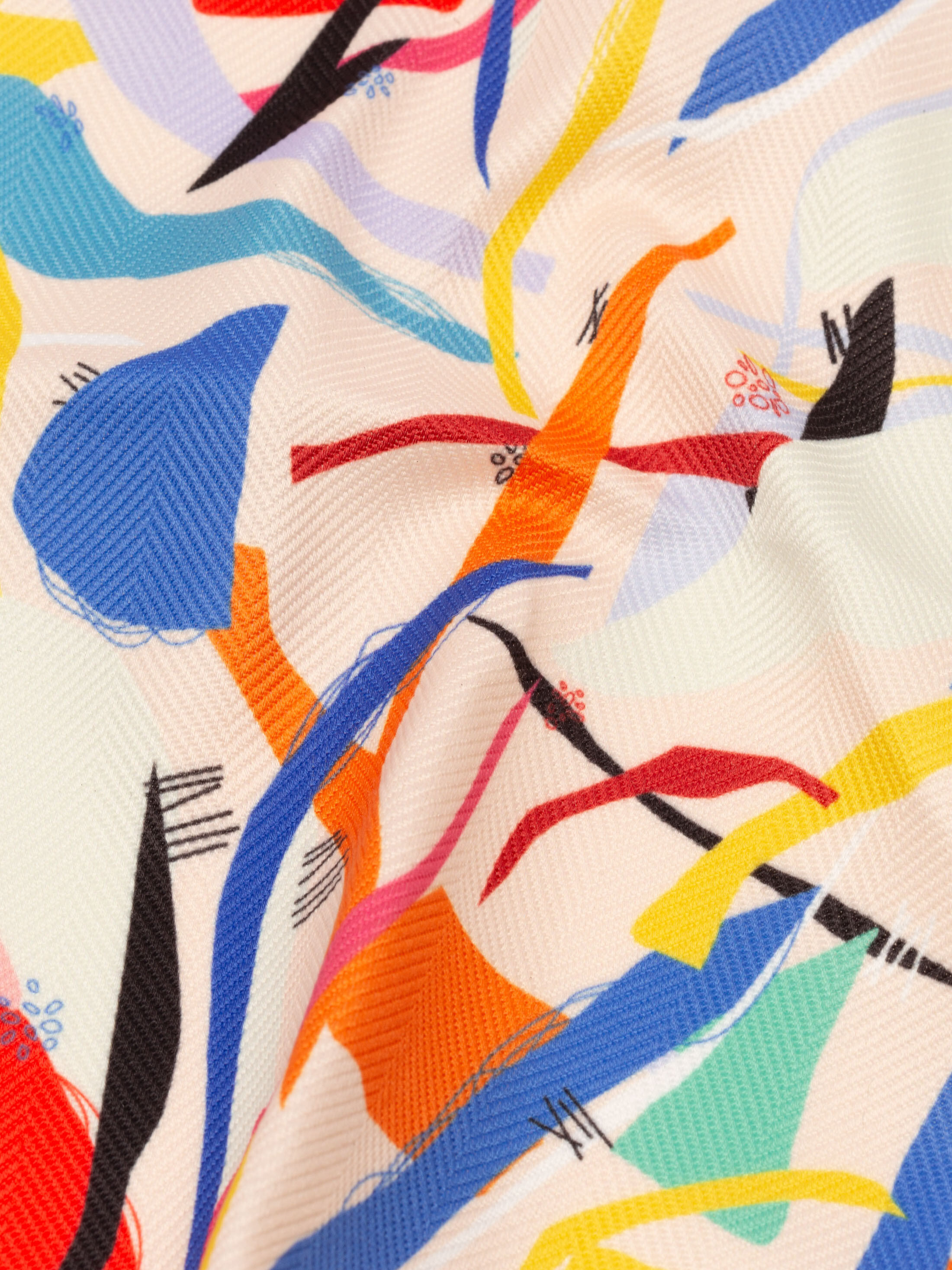 生地のベースカラーはオフホワイトで、クリームベースとなります。色合いは鮮やかなコントラストがあり、暗めの色では特に強意印象があります。プリントのディテールは、細かいラインも綺麗に出るが、薄く弱い色のものはオフホワイトと表面のテクスチャーによってはっきりと表現できない可能性があるので、出来るだけ避けるのが無難です。