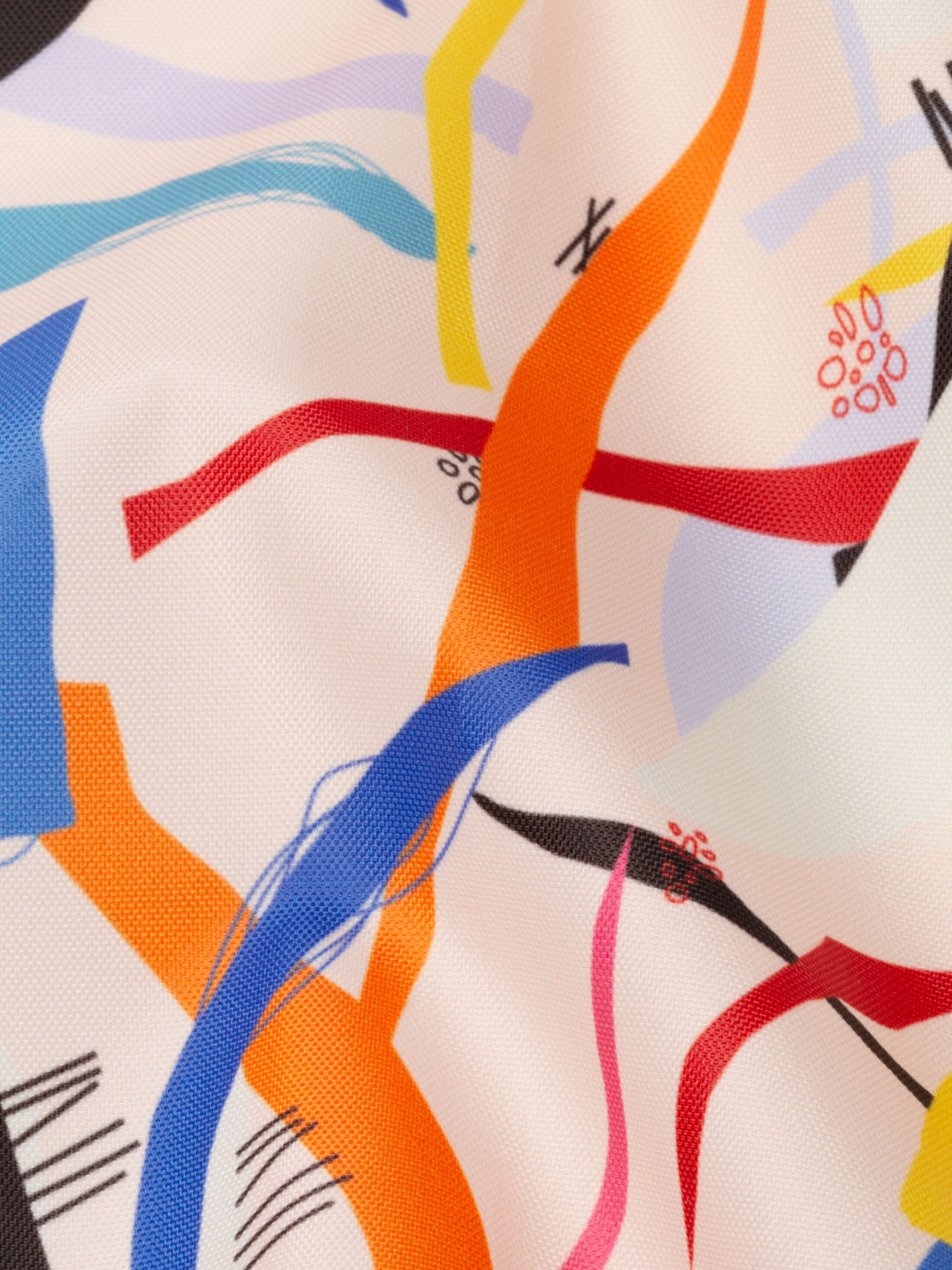 リンデン・ウォータープルーフは平織りでタイトな生地で、細かいディテールと鮮やかな色彩を表現できます。ほつれが出ない特徴があり、生地の切り口がとてもシャープです。120gsmの重さで薄い素材ですが、ぴんと張った生地はとても丈夫です。伸縮性はなく、100%防水加工の施された生地となります。